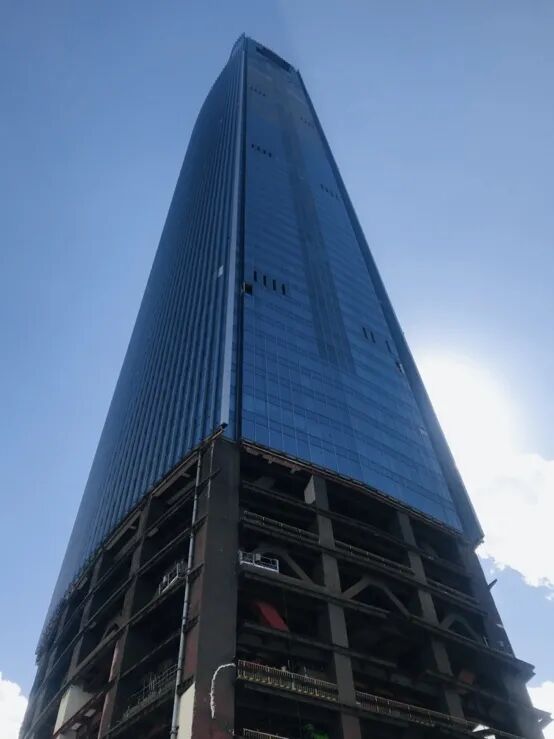 目前,该期项目主体结构除架空层环带及一层后浇带未施工,其余部分已按设计施工完成,主体结构验收完成到40层;二次结构(砌体部分)完成约70%,水电预留预埋完成,水电安装完成约35%,防火涂料完成约65%,工程已封顶且玻璃幕墙基本完工。