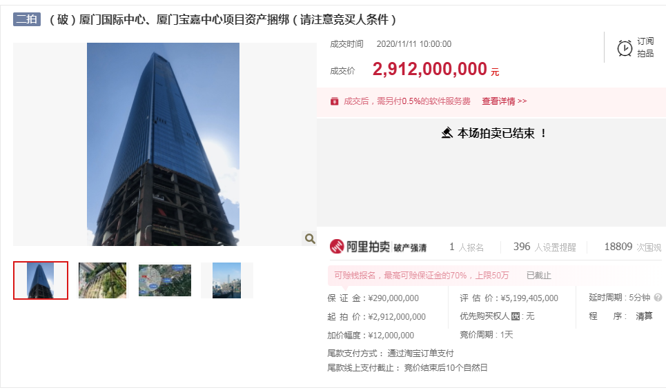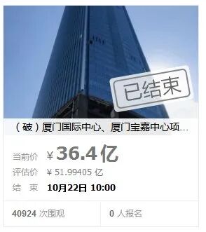 10月21日,厦门第一高楼在阿里法拍进行第一次拍卖,遗憾的是,1天的拍卖时间过去后,以流拍告终,而此次二次拍卖,在价格下调和放宽竞拍门槛之后,终于成功出手!真是可喜可贺!