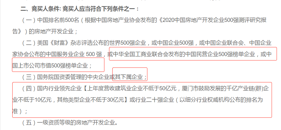 3、国内行业领先企业从“上年度营收不低于人民币100亿元”放宽为“上年度营收建筑业企业不低于50亿元,厦门市鼓励发展的千亿产业链(群)企业不低于10亿元,其他类型企业不低于30亿元”;